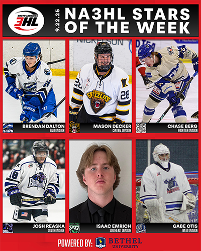 The North American 3 Hockey League (NA3HL) is pleased to announce the Divisional Stars of the Week for the week ending September 21, sponsored by Bethel University. This weekly award recognizes the top-performing players from each of the league’s six divisions, as nominated by their head coaches, for their outstanding contributions on the ice.