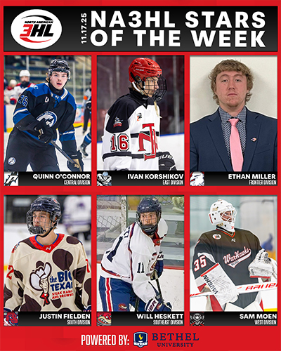 The North American 3 Hockey League (NA3HL) is pleased to announce the Divisional Stars of the Week for the week ending November 16th, sponsored by Bethel University. This weekly award recognizes the top-performing players from each of the league’s six divisions, as nominated by their head coaches, for their outstanding contributions on the ice.