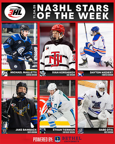The North American 3 Hockey League (NA3HL) is pleased to announce the Divisional Stars of the Week for the week ending November 23rd, sponsored by Bethel University. This weekly award recognizes the top-performing players from each of the league’s six divisions, as nominated by their head coaches, for their outstanding contributions on the ice.