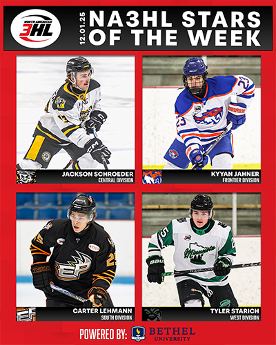 The North American 3 Hockey League (NA3HL) is pleased to announce the Divisional Stars of the Week for the week ending November 30th, sponsored by Bethel University. This weekly award recognizes the top-performing players from each of the league’s six divisions, as nominated by their head coaches, for their outstanding contributions on the ice.