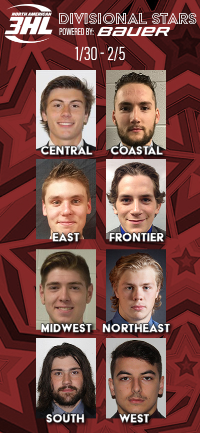 The North American 3 Hockey League (NA3HL) announced today the Divisional Stars of the Week presented by Bauer Hockey for the week ending February 5, 2017. The divisional stars of the week are an award given each week of the regular season to the top performing players in each of the eight divisions of the NA3HL as nominated by their head coaches.