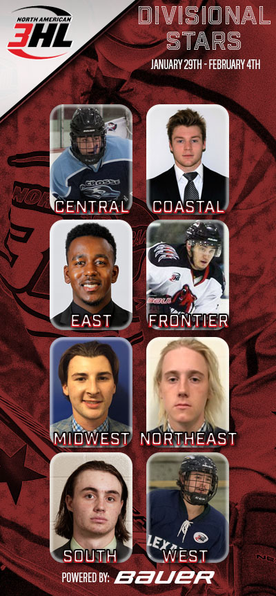 The North American 3 Hockey League (NA3HL) today announced the Divisional Stars of the Week presented by Bauer Hockey for the week ending February 4, 2018. The divisional stars of the week is an award given each week of the regular season to the top performing players in each of the eight divisions of the NA3HL as nominated by their head coaches.