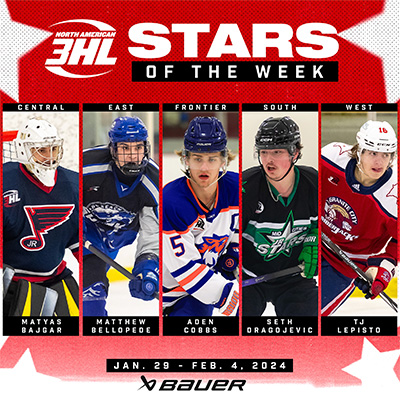 The North American 3 Hockey League (NA3HL) today announced the Divisional Stars of the Week presented by Bauer Hockey for the week ending February 4th. The Divisional Stars of the Week is an award given each week of the regular season to the top performing players in each of the five divisions of the NA3HL as nominated by their head coaches.