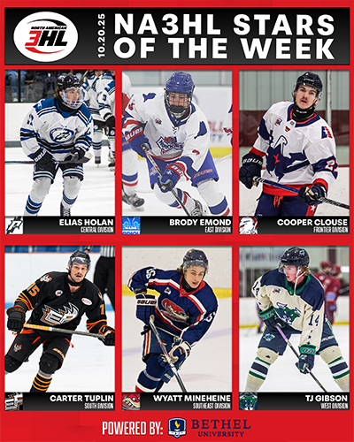 The North American 3 Hockey League (NA3HL) is pleased to announce the Divisional Stars of the Week for the week ending October 19, sponsored by Bethel University. This weekly award recognizes the top-performing players from each of the league’s six divisions, as nominated by their head coaches, for their outstanding contributions on the ice.