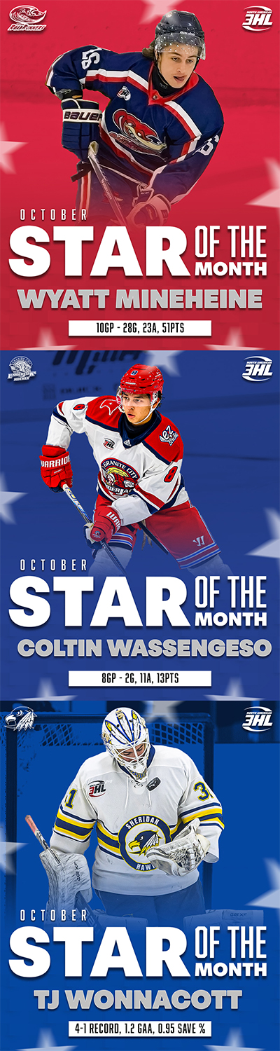 The North American 3 Hockey League (NA3HL) has announced its monthly player awards for October. Texas RoadRunners forward Wyatt Mineheine has been recognized as Forward of the Month, Granite City Lumberjacks Coltin Wassengeso earned Defenseman of the Month honors, and Sheridan Hawks goaltender TJ Wonnacott was named Goaltender of the Month.