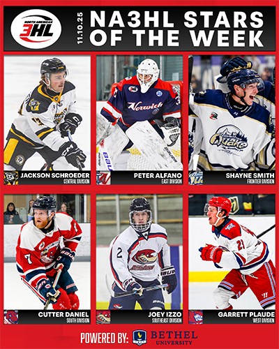 The North American 3 Hockey League (NA3HL) is pleased to announce the Divisional Stars of the Week for the week ending November 9th, sponsored by Bethel University. This weekly award recognizes the top-performing players from each of the league’s six divisions, as nominated by their head coaches, for their outstanding contributions on the ice.